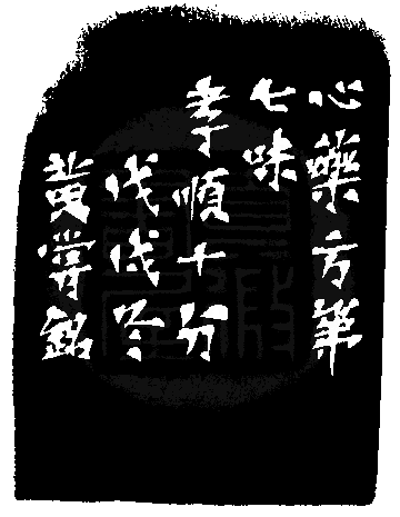 黃嘗銘.六十五歲/刻〔孝順十分〕正方朱文印。邊款為【《心藥方》第七味,孝順十分。戊戌冬,黃嘗銘。】老撾石。自然頂。