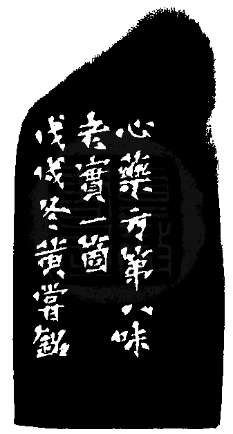 黃嘗銘.六十五歲/刻〔老實一箇〕長方朱文印。邊款為【《心藥方》第八味,老實一箇。戊戌冬,黃嘗銘。】老撾石。自然頂。