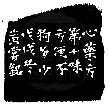 黃嘗銘.六十五歲/刻〔方便不拘多少〕正方白文縱格印。邊款為【《心藥方》第十味,方便不拘多少。戊戌冬,黃嘗銘。】老撾石。自然頂。