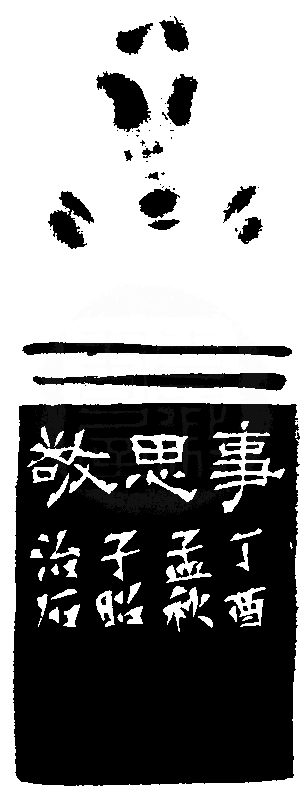 黃嘗銘.六十四歲/刻〔事思敬〕正方朱文印。邊款為【事思敬。丁酉孟秋,子昭治石。】芙蓉石。獸鈕。