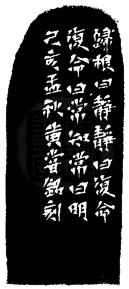 黃嘗銘.六十六歲/刻〔知常曰明〕正方加框白文印。邊款為【歸根曰淨,淨曰復命。復命曰常,知常曰明。己亥孟秋,黃嘗銘刻。】老撾田黃。自然頂。