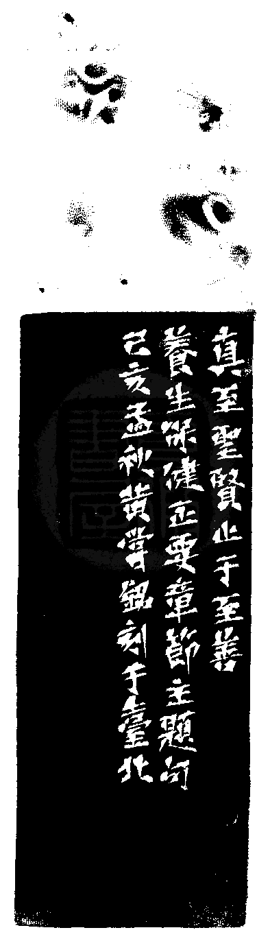 黃嘗銘.六十六歲/刻〔真至聖賢止于至善〕正方朱文印。邊款為【真至聖賢,止于至善。養生保健正要章節主題句。己亥孟秋,黃嘗銘刻于臺北。】青田石。