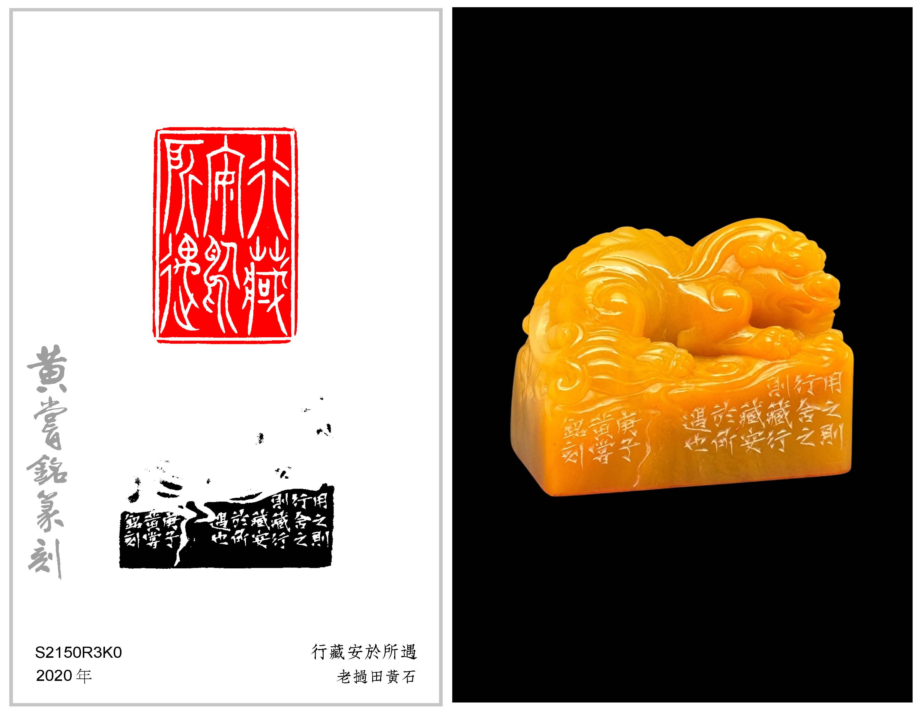 黃嘗銘.六十七歲/刻〔行藏安於所遇〕長方加框白文印。邊款為【用之則行,舍之則藏,行藏安於所遇也。庚子,黃嘗銘刻。】老撾田黃石。古獸鈕。