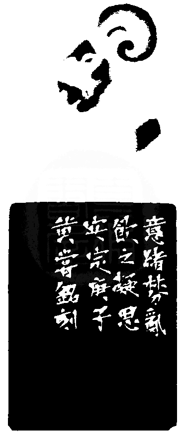 黃嘗銘.六十七歲/刻〔意緒紛亂〕正方朱文印。邊款為【意緒棼亂,飲之凝思安定。庚子,黃嘗銘刻。】老撾田黃石。羊鈕。