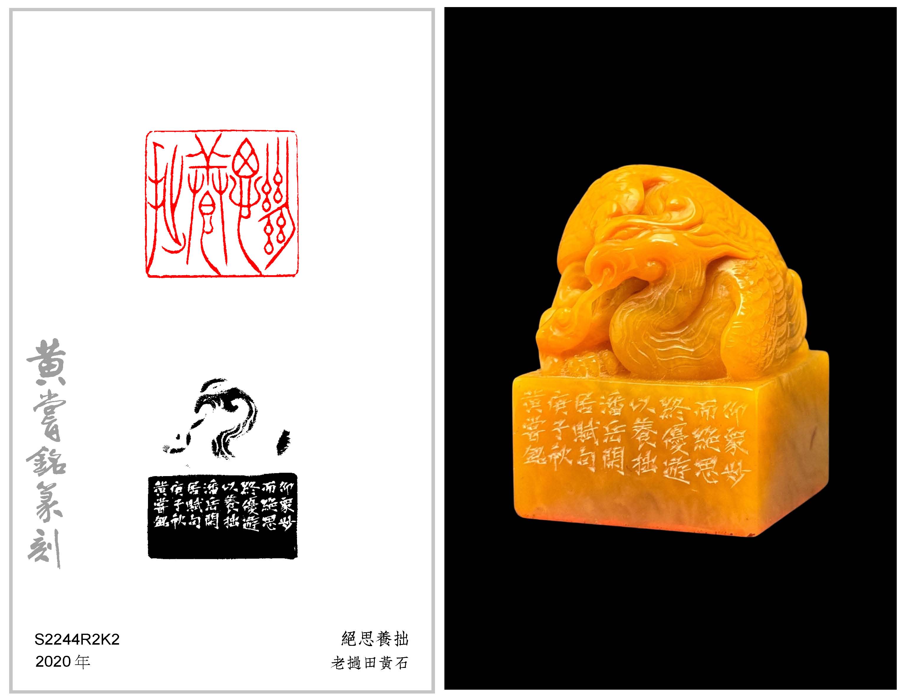 黃嘗銘.六十七歲/刻〔絕思養拙〕正方朱文印。邊款為【仰眾妙而絕思,終優游以養拙。潘岳《閑居賦》句。庚子秋,黃嘗銘。】老撾田黃石。鳳鈕。