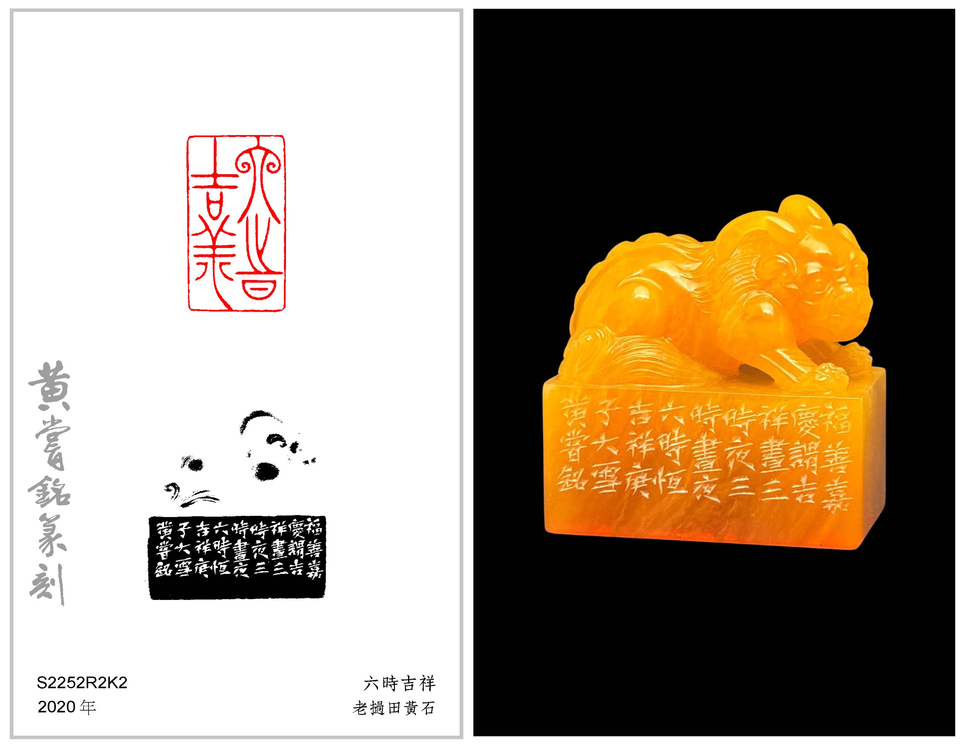 黃嘗銘.六十七歲/刻〔六時吉祥〕長方朱文印。邊款為【福善嘉慶謂吉祥,晝三時,夜三時,晝夜六時恆吉祥。庚子大雪,黃嘗銘。】老撾田黃石。雙角獸鈕。