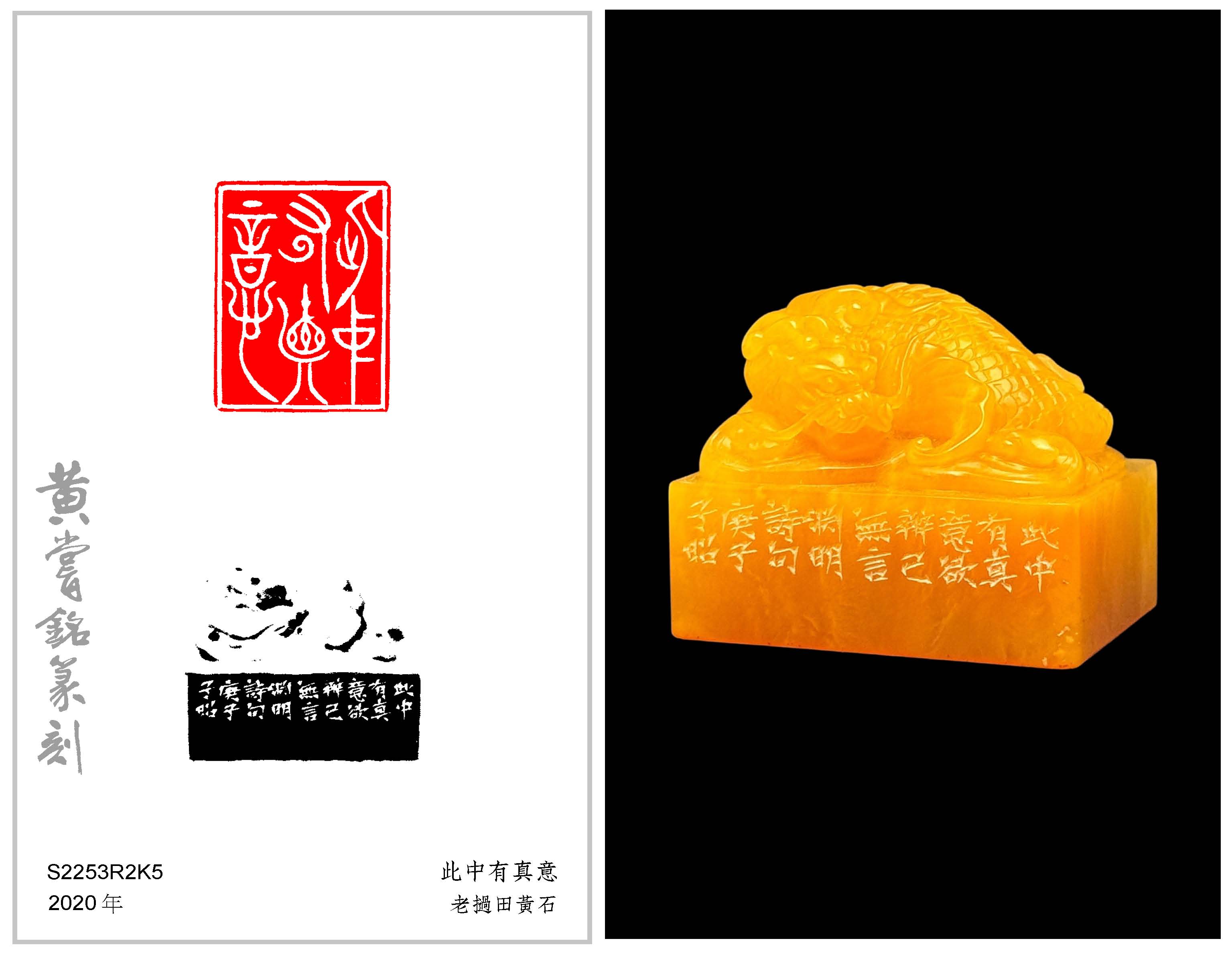 黃嘗銘.六十七歲/刻〔此中有真意〕長方加框白文印。邊款為【此中有真意,欲辨已忘言。淵明詩句。庚子大雪,子昭。】老撾田黃石。鰲龍鈕。