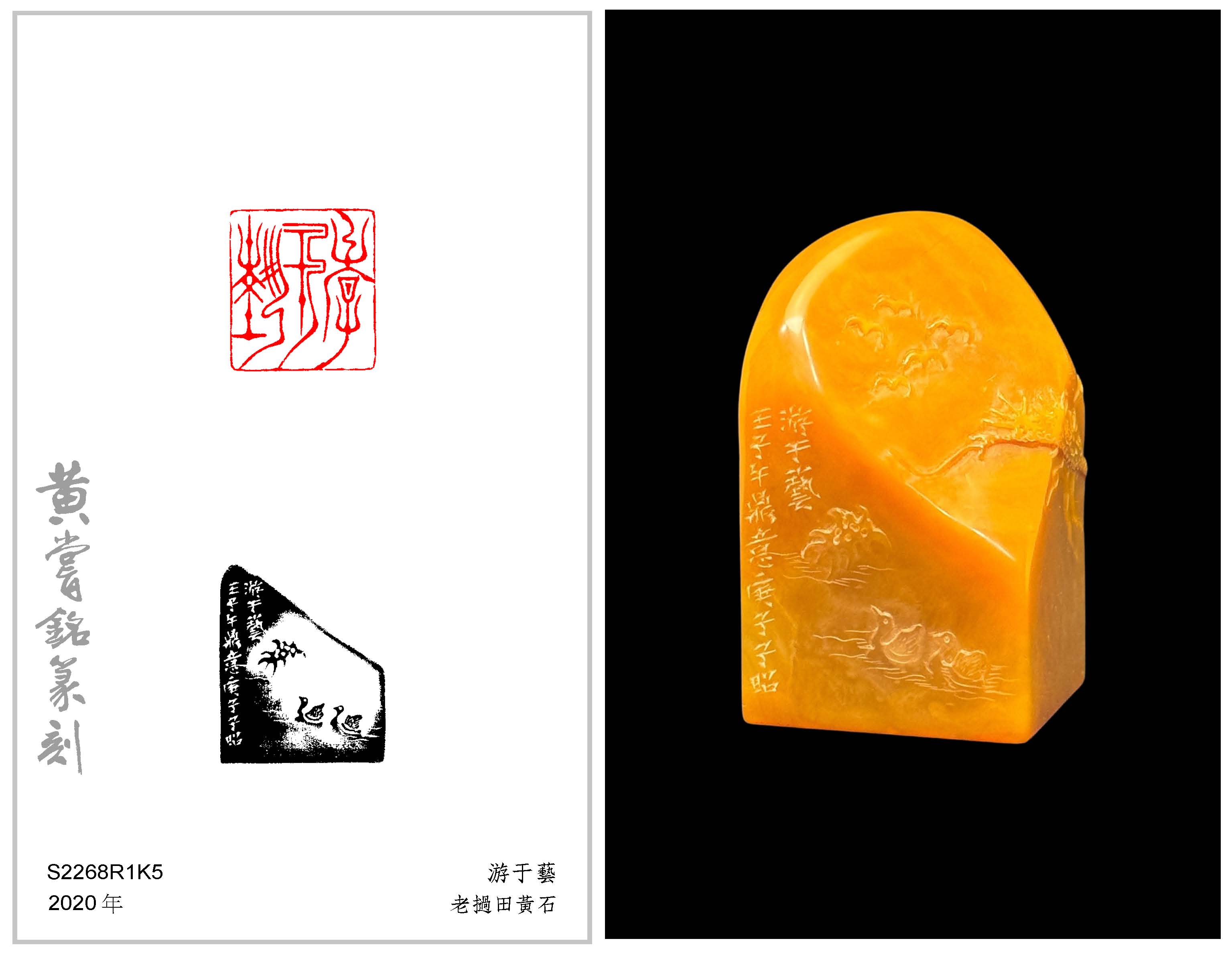 黃嘗銘.六十七歲/刻〔游于藝〕長方朱文印。邊款為【游于藝。王子午鼎意,庚子,子昭。】老撾田黃石。山水薄意鈕。