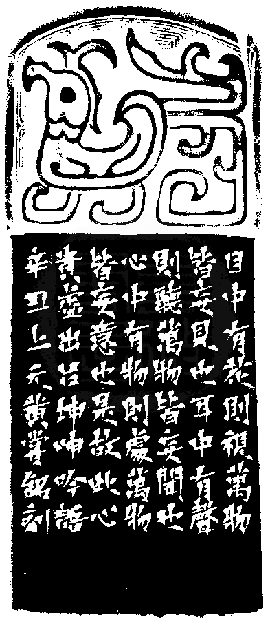 黃嘗銘.六十八歲/刻〔此心貴虛〕正方朱文印。邊款為【目中有花,則視萬物皆妄見也;耳中有聲,則聽萬物皆妄聞也。心中有物,則處萬物皆妄意也。是故此心貴虛。出呂坤《呻吟語》。辛丑上元,黃嘗銘刻。】老撾石。鳳形博古鈕。