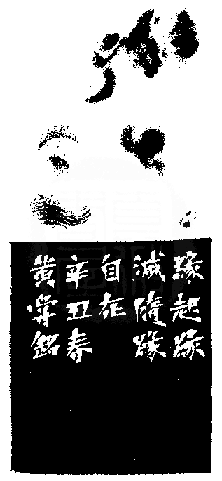 黃嘗銘.六十八歲/刻〔隨緣〕長方朱文印。邊款為【緣起緣滅,隨緣自在。辛丑春,黃嘗銘。】老撾田黃石。雙角獸鈕。