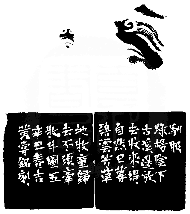 黃嘗銘.六十八歲/刻〔馴服〕正方朱文印。邊款為【馴服。綠楊陰下古溪邊,放去收來得自然,日暮碧雲芳草地,牧童歸去不須牽。《牧牛圖》五。辛丑春吉,黃嘗銘刻。】原印今藏於簡國釧。老撾田黃石。獨角獸鈕。