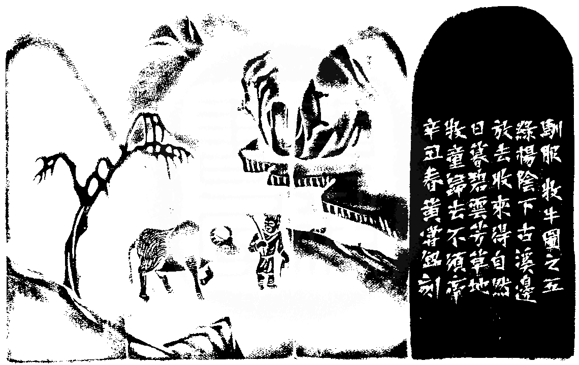 黃嘗銘.六十八歲/刻〔馴服〕長方加框白文印。邊款為【馴服。《牧牛圖》之五。綠楊陰下古溪邊,放去收來得自然,日暮碧雲芳草地,牧童歸去不須牽。辛丑春,黃嘗銘刻。】老撾田黃石。牧牛圖薄意。