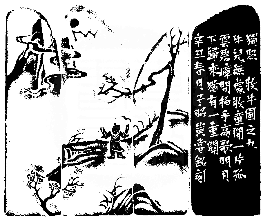 黃嘗銘.六十八歲/刻〔獨照〕長方朱文印。邊款為【獨照。《牧牛圖》之九。牛兒無處牧童閒,一片孤雲碧嶂間,拍手高歌明月下,歸來猶有一重關。辛丑春月,子昭黃嘗銘刻。】老撾田黃石。牧牛圖薄意。