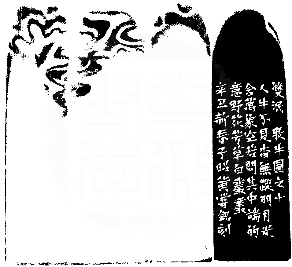 黃嘗銘.六十八歲/刻〔雙泯〕長方朱文印。邊款為【雙泯。《牧牛圖》之十。人牛不見杳無蹤,明月光含萬象空,若問其中端的意,野花芳草白叢叢。辛丑新春,子昭黃嘗銘刻。】老撾田黃石。雲天薄意。