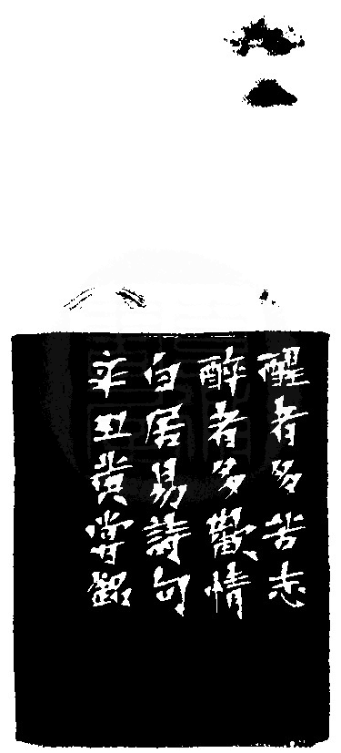 黃嘗銘.六十八歲/刻〔多歡情〕長方加框白文印。邊款為【醒者多苦志,醉者多歡情。白居易詩句。辛丑,黃嘗銘。】老撾石。獸鈕。