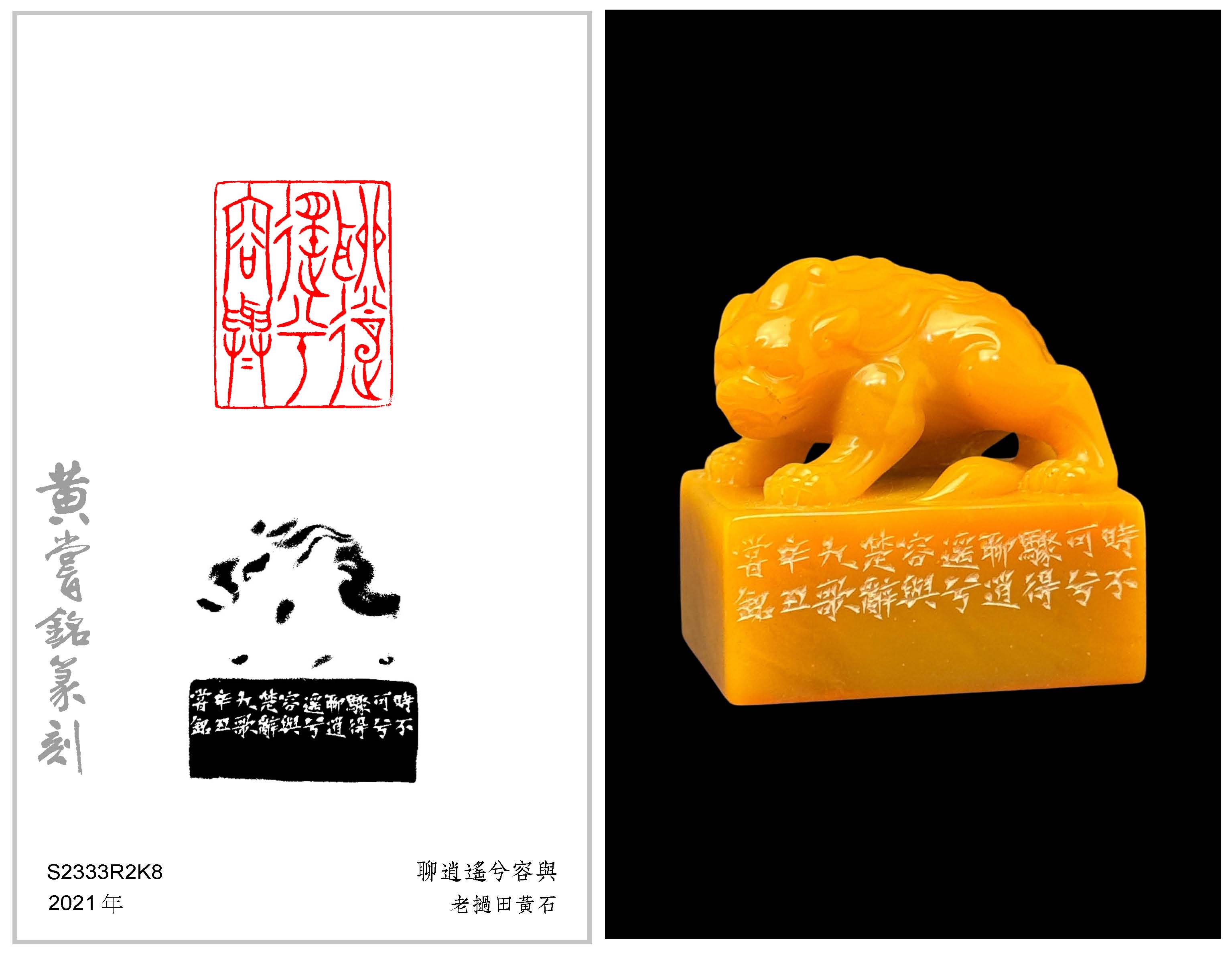 黃嘗銘.六十八歲/刻〔聊逍遙兮容與〕長方朱文印。邊款為【時不可兮驟得,聊逍遙兮容與!《楚辭·九歌》。辛丑,嘗銘。】老撾田黃石。古獸鈕。