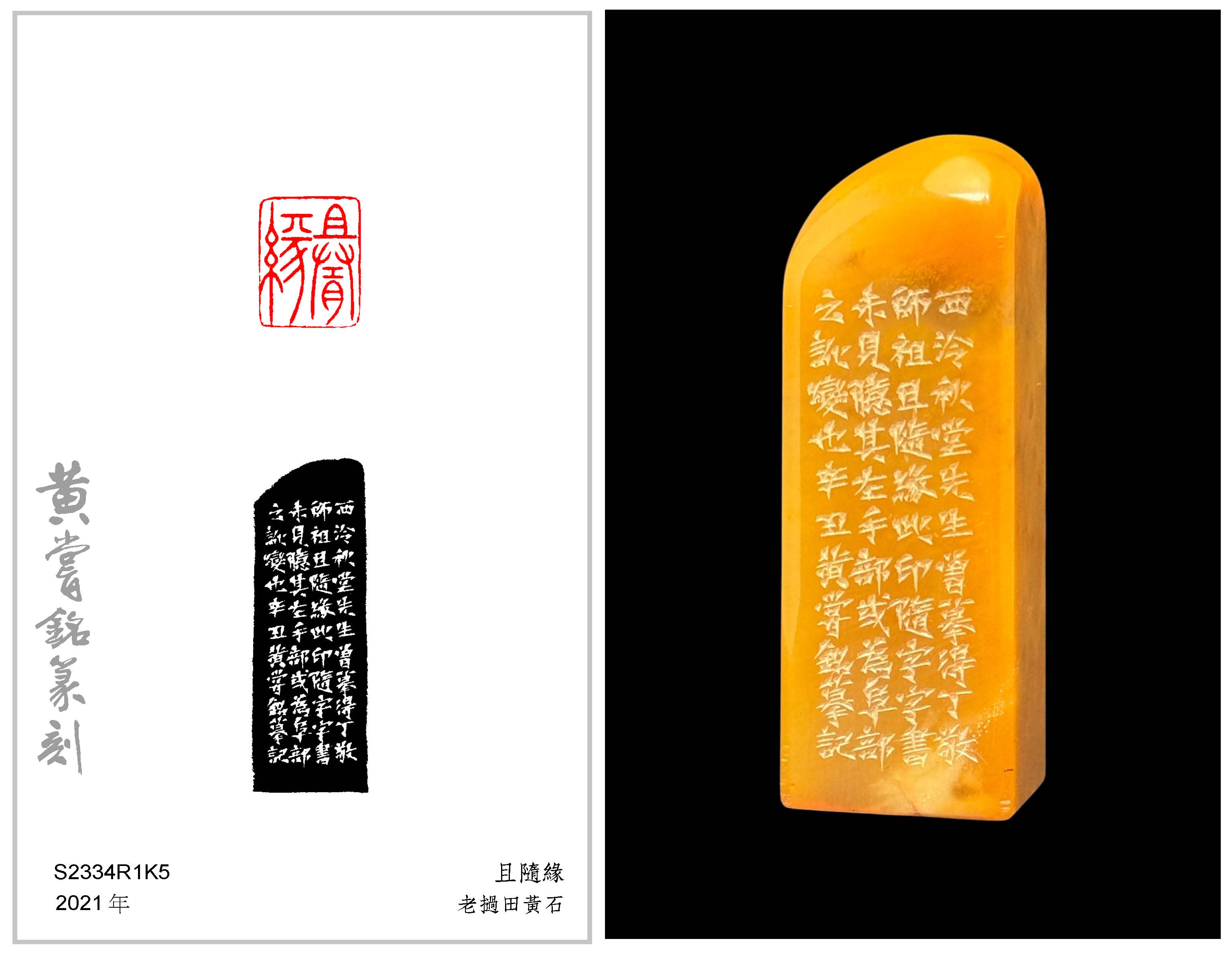 黃嘗銘.六十八歲/刻〔且隨緣〕長方朱文印。邊款為【西泠秋堂先生曾摹得丁敬師祖且隨緣此印,隨字字書未見,臆其左手部或為阜部之訛變也。辛丑,黃嘗銘摹記。】老撾田黃石。自然頂。