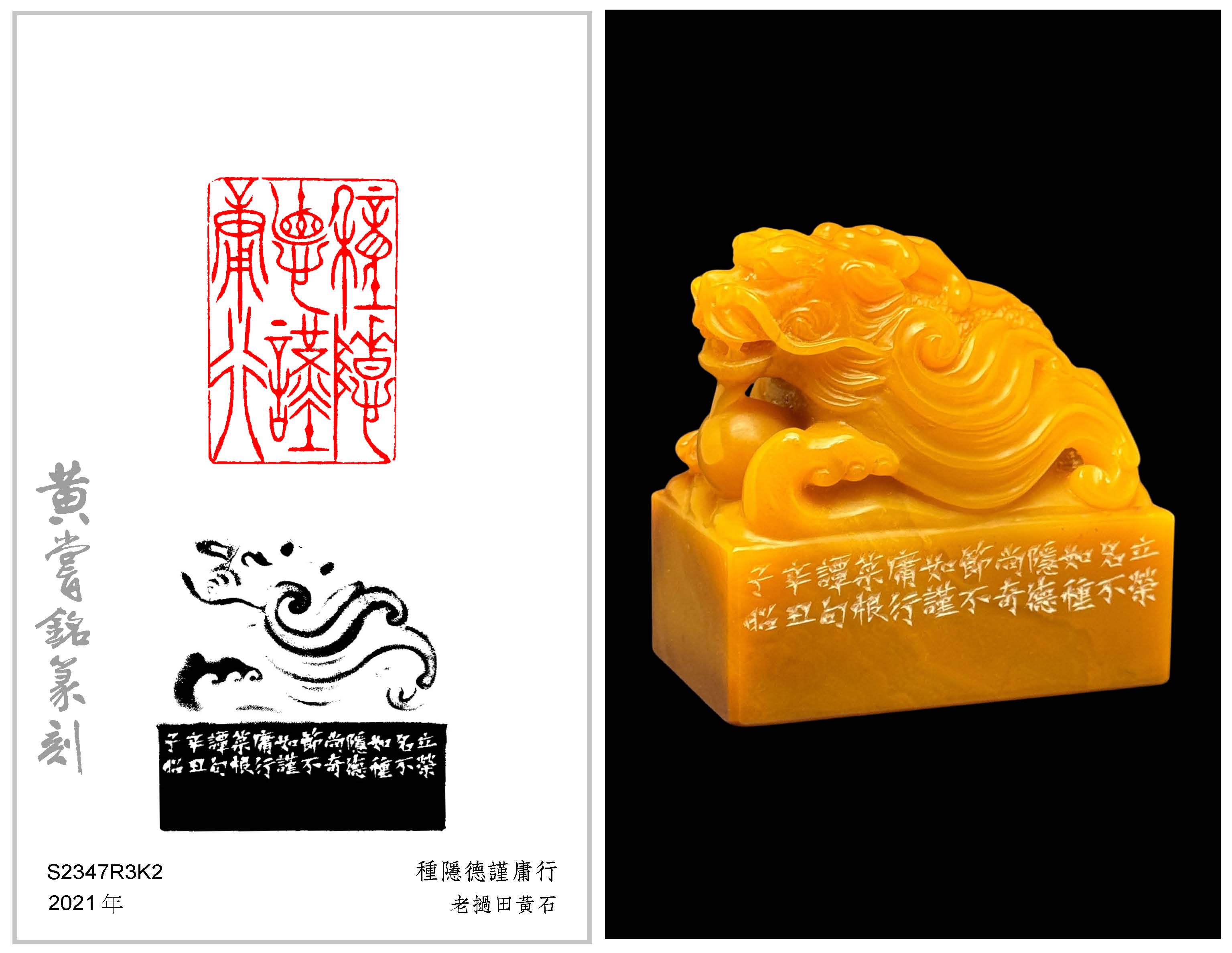 黃嘗銘.六十八歲/刻〔種隱德謹庸行〕長方朱文印。邊款為【立榮名,不如種隱德;尚奇節,不如謹庸行。《菜根譚》句。辛丑,子昭。】老撾田黃石。鰲龍鈕。