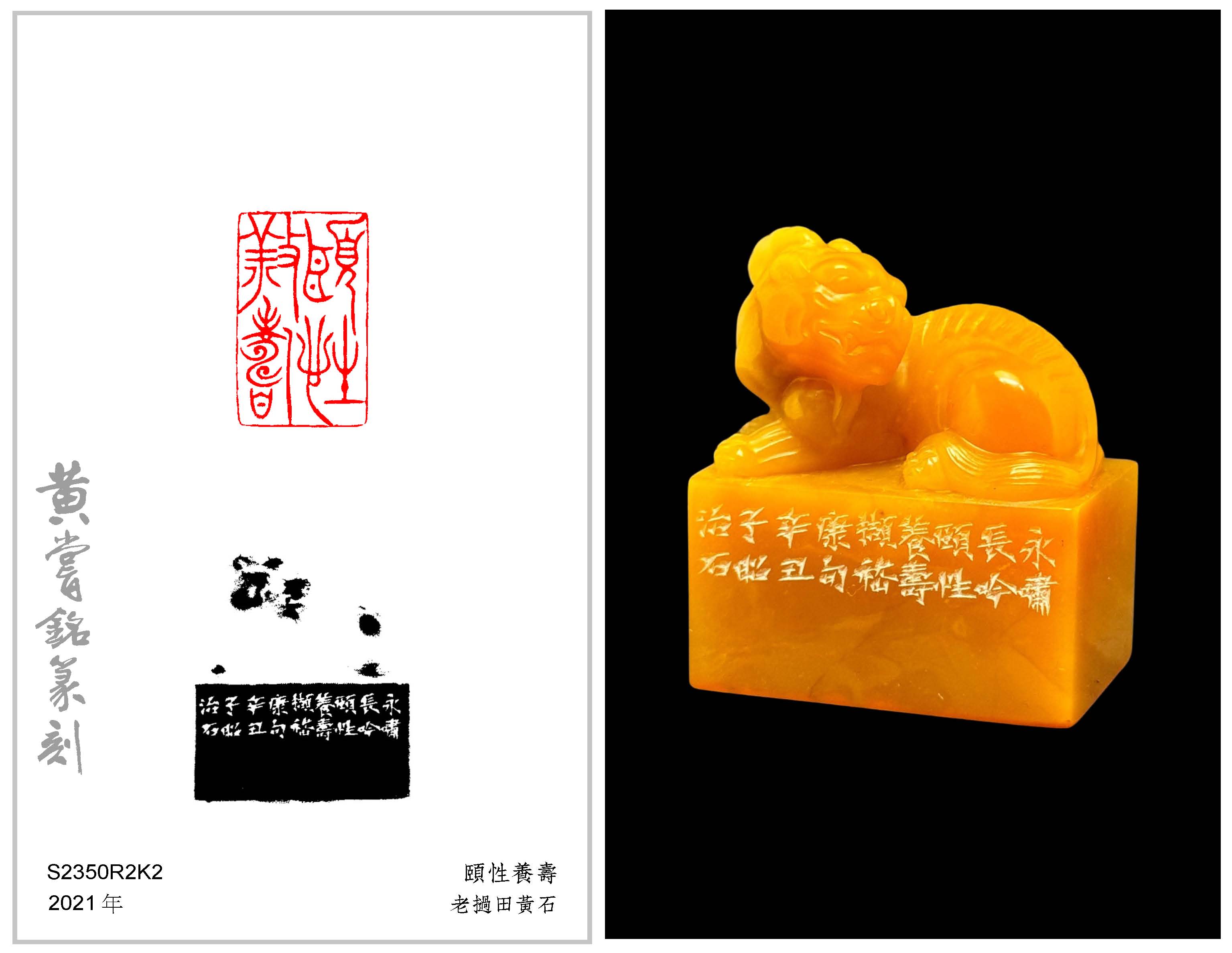 黃嘗銘.六十八歲/刻〔頤性養壽〕長方朱文印。邊款為【永嘯長吟,頤性養壽。擷嵇康句。辛丑,子昭治石。】老撾田黃石。雙角獸鈕。