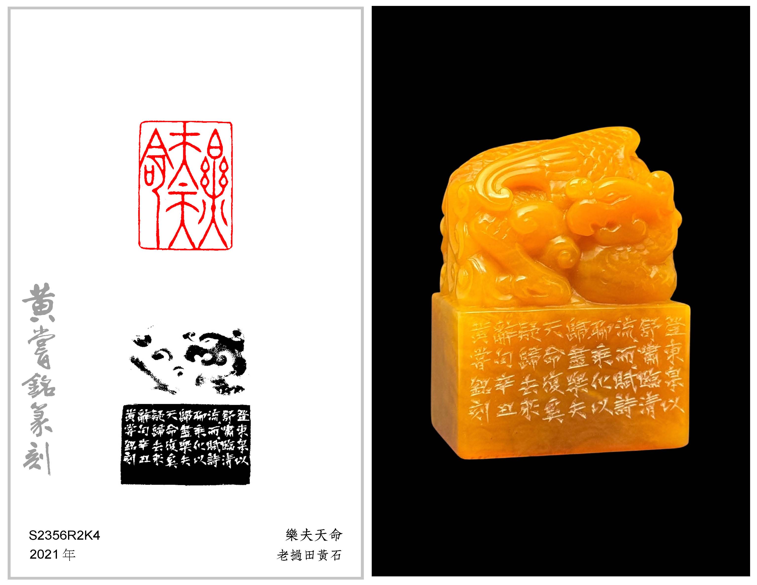 黃嘗銘.六十八歲/刻〔樂夫天命〕長方朱文印。邊款為【登東皋以舒嘯,臨清流而賦詩。聊乘化以歸盡,樂夫天命復奚疑?《歸去來辭》句。辛丑,黃嘗銘刻。】老撾田黃石。鳳鈕。