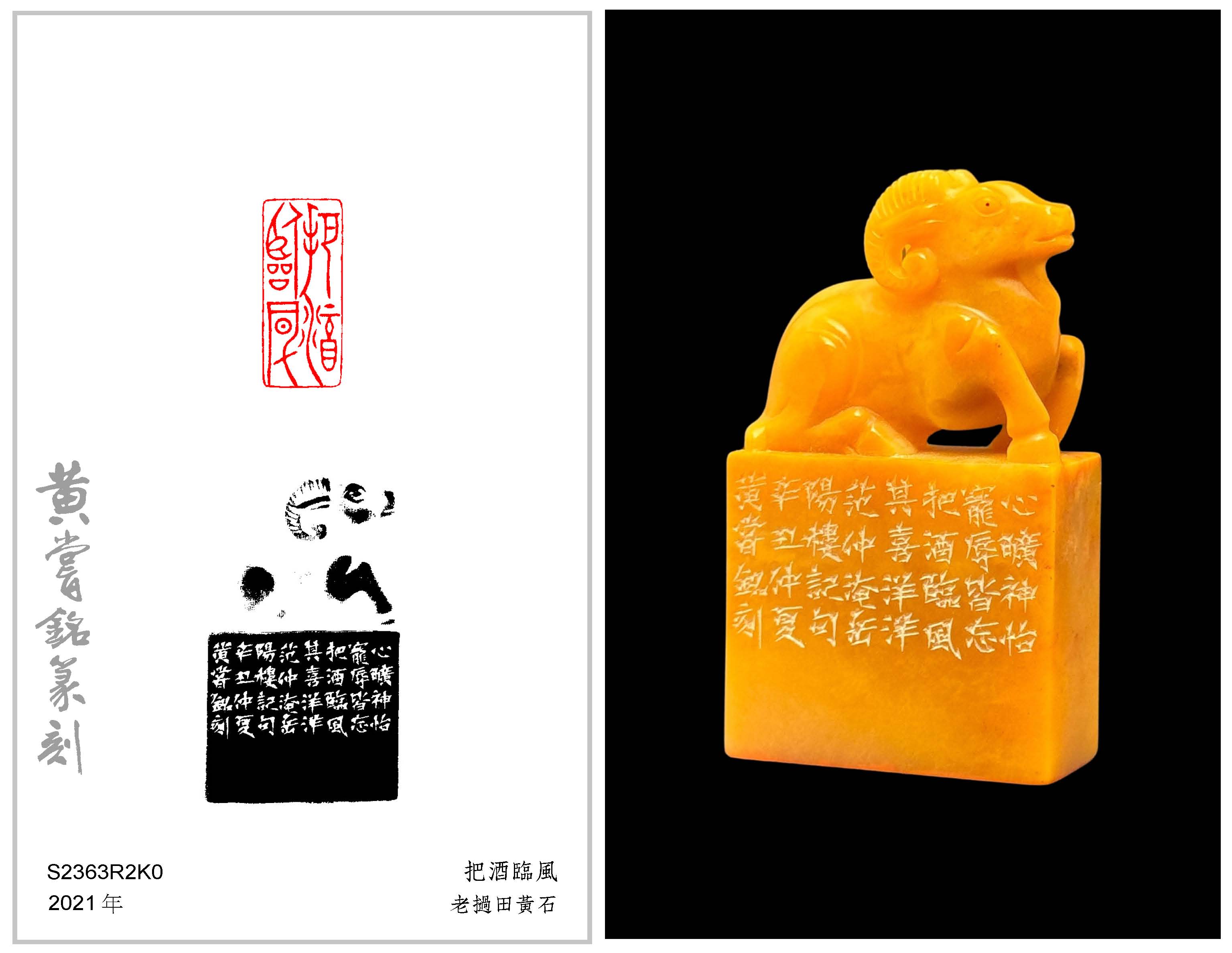 黃嘗銘.六十八歲/刻〔把酒臨風〕長方朱文印。邊款為【心曠神怡,寵辱皆忘,把酒臨風,其喜洋洋。范仲淹《岳陽樓記》句。辛丑仲夏,黃嘗銘刻。】老撾田黃石。伏羊鈕。