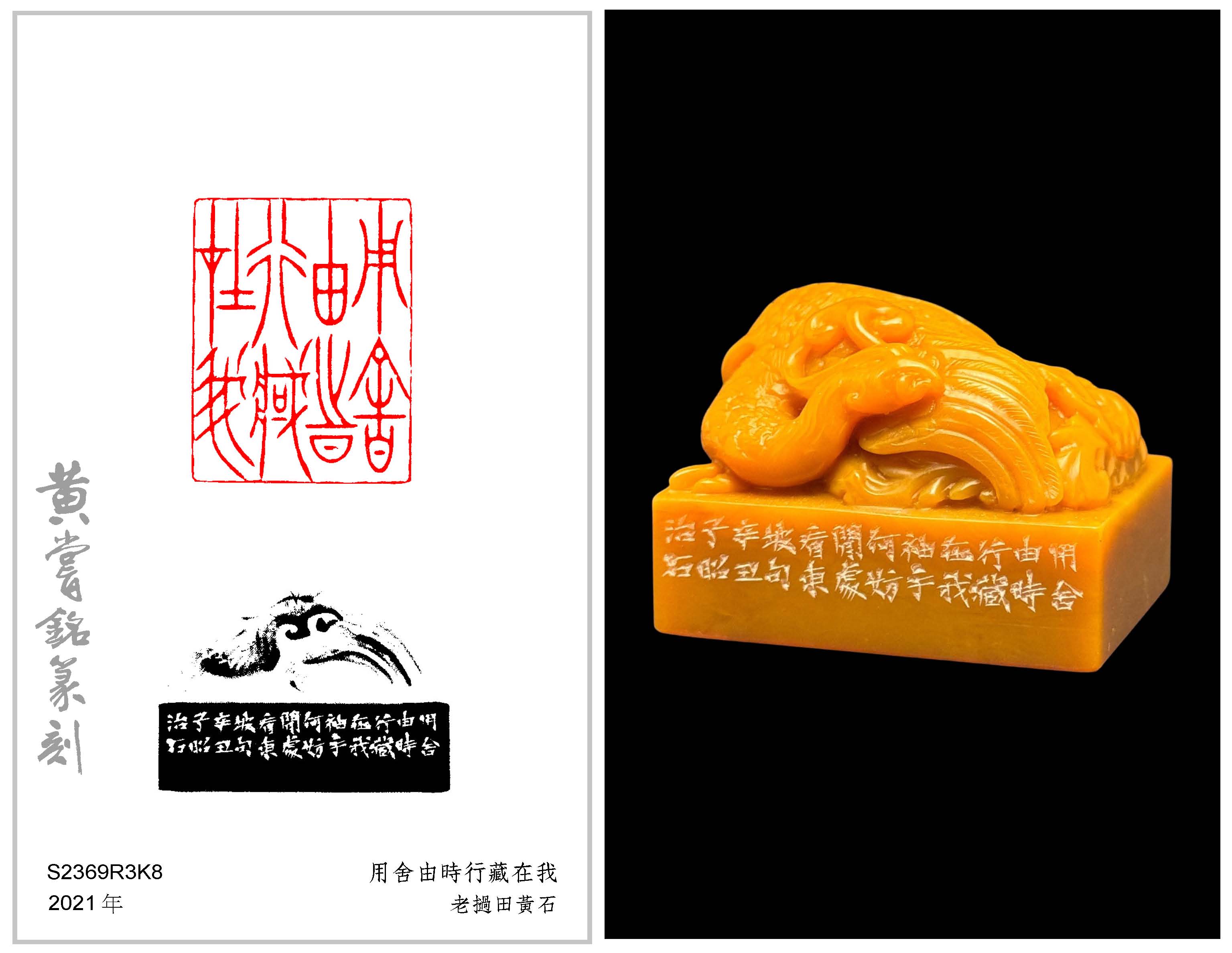 黃嘗銘.六十八歲/刻〔用舍由時行藏在我〕長方朱文印。邊款為【用舍由時,行藏在我,袖手何妨閒處看。東坡句。辛丑,子昭治石。】老撾田黃石。鳳鈕。