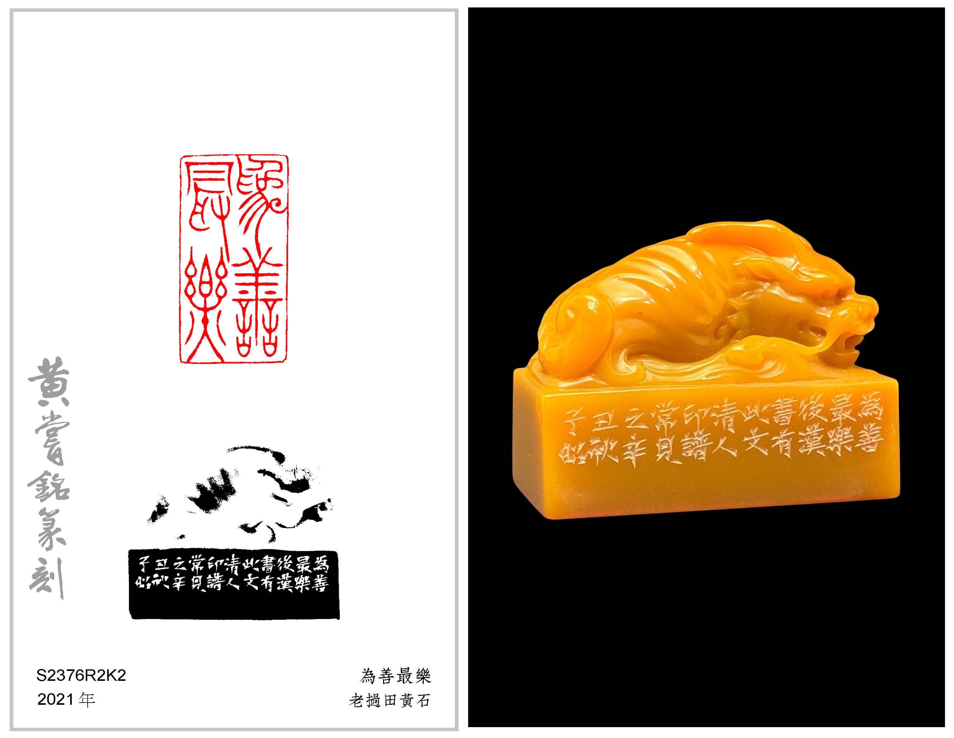 黃嘗銘.六十八歲/刻〔為善最樂〕長方朱文印。邊款為【為善最樂。《後漢書》有此文,清人印譜常見之。辛丑秋,子昭。】老撾田黃石。鰲龍鈕。