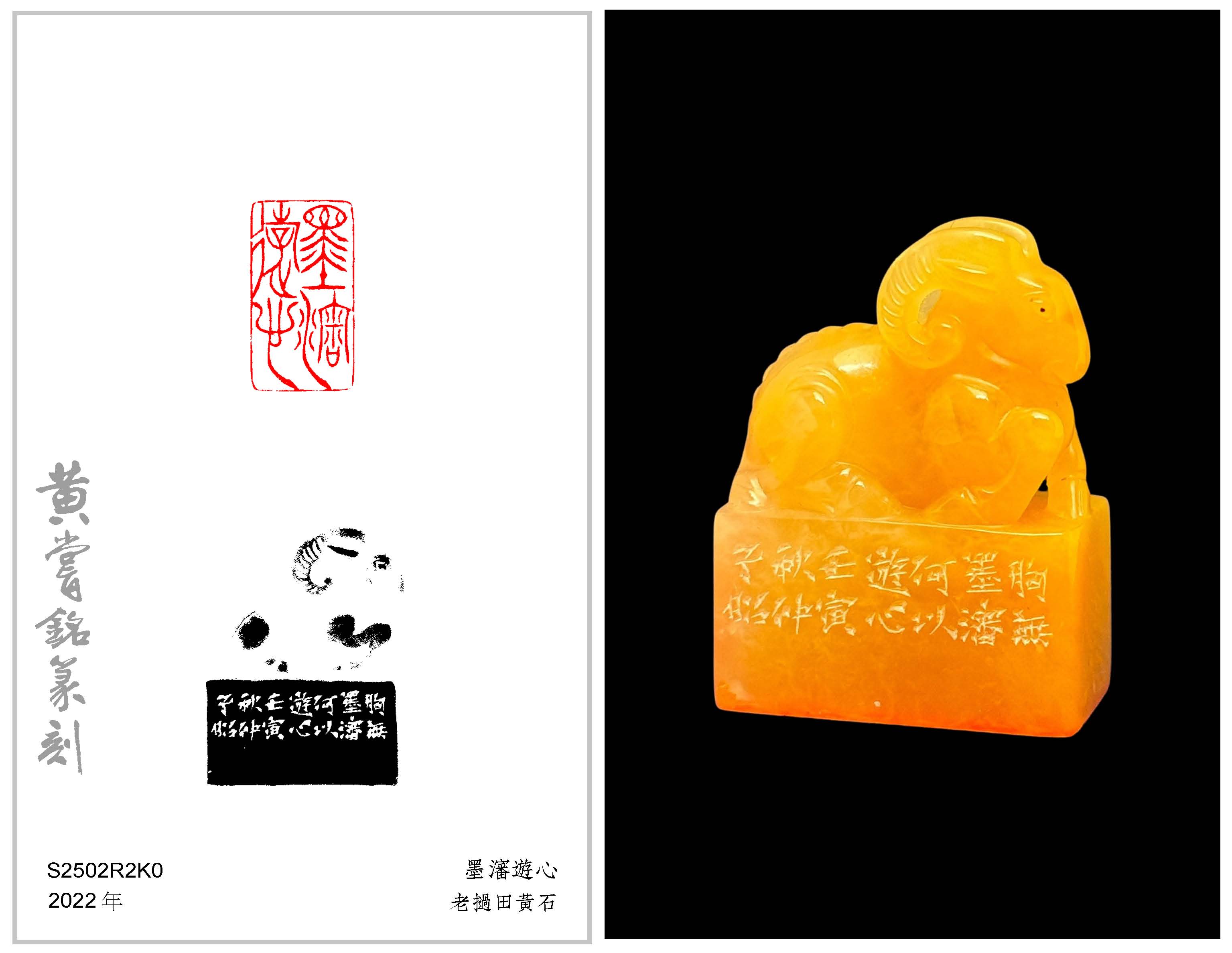 黃嘗銘.六十九歲/刻〔墨瀋遊心〕長方朱文印。邊款為【胸無墨瀋,何以遊心。壬寅秋仲,子昭。】老撾田黃石。伏羊鈕。
