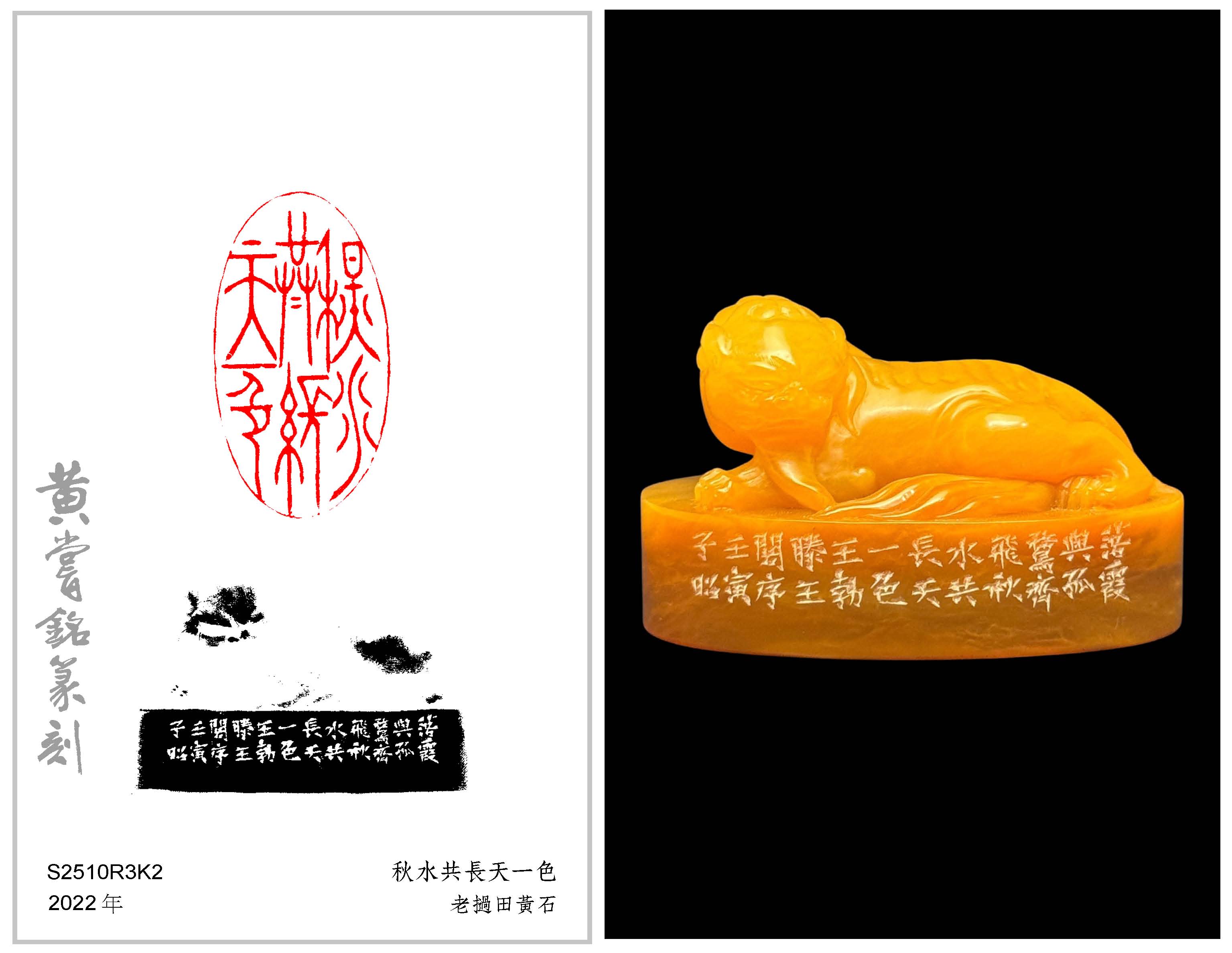 黃嘗銘.六十九歲/刻〔秋水共長天一色〕長橢圓朱文印。邊款為【落霞與孤鶩齊飛,秋水共長天一色。王勃《滕王閣序》。壬寅,子昭。】老撾田黃石。古獸鈕。