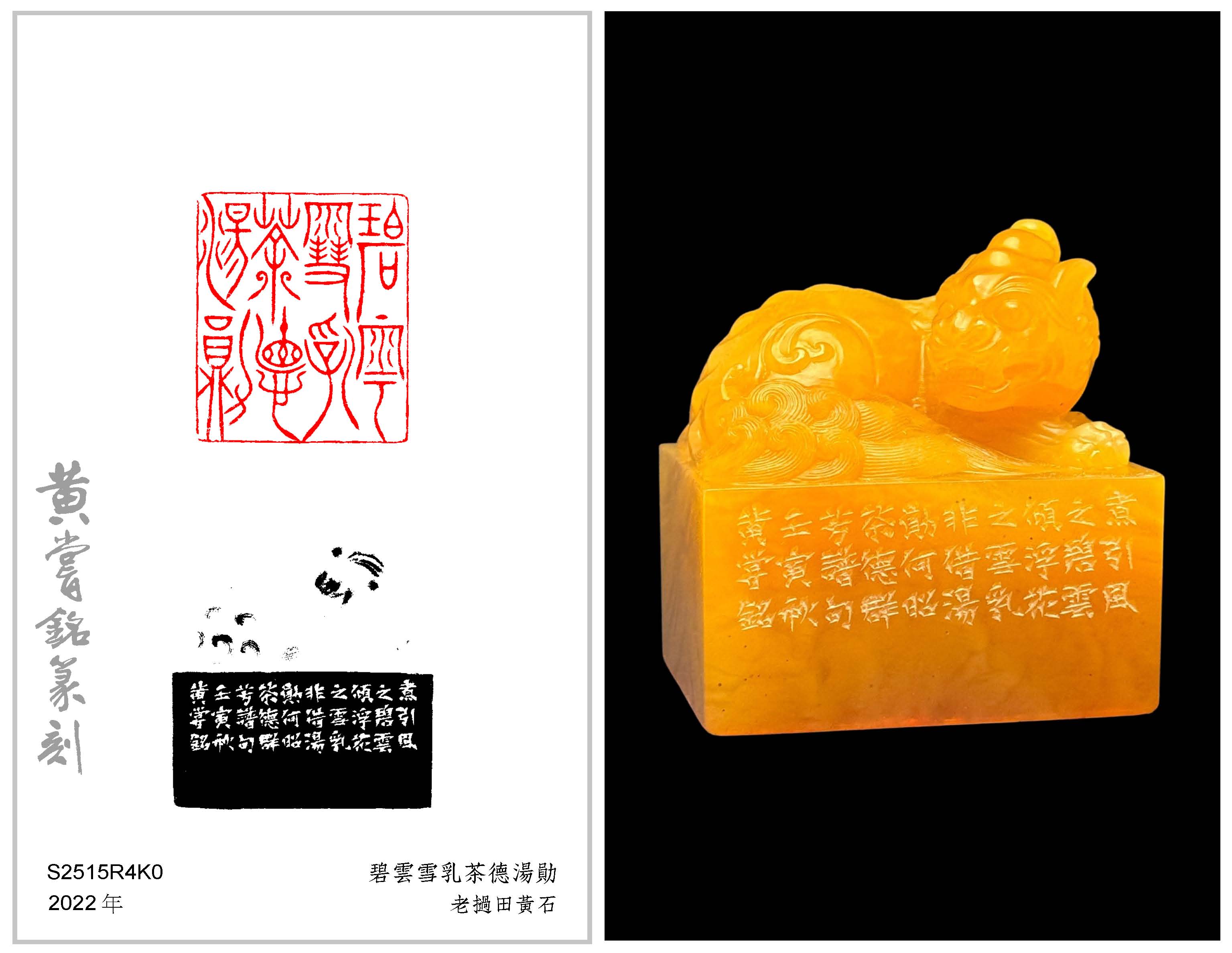 黃嘗銘.六十九歲/刻〔碧雲雪乳茶德湯勛〕長方朱文印。邊款為【煮引風之碧雲,傾浮花之雪乳。非借湯勛,何昭茶德?《群芳譜》句。壬寅秋,黃嘗銘。】老撾田黃石。獨角獸鈕。