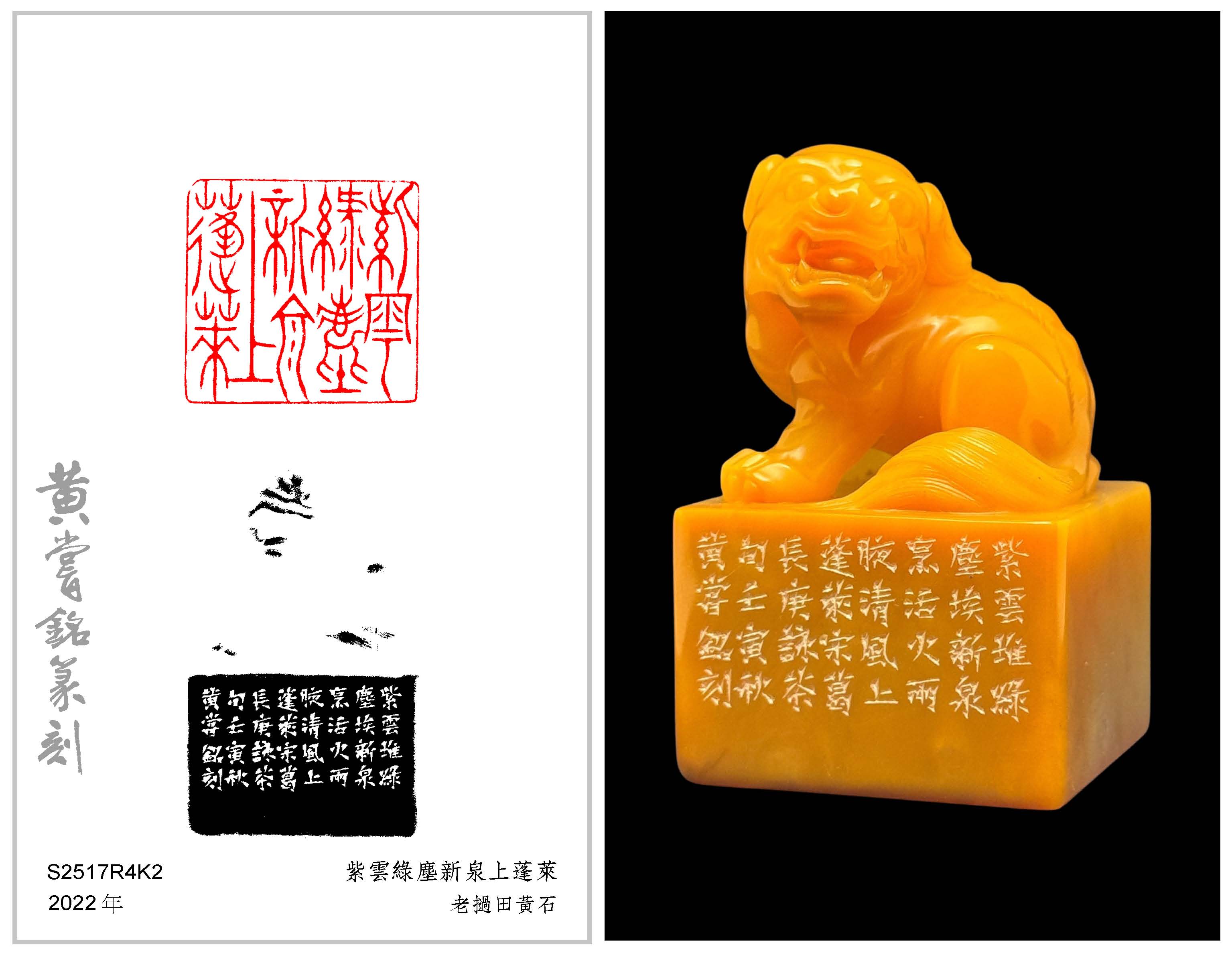 黃嘗銘.六十九歲/刻〔紫雲綠塵新泉上蓬萊〕正方朱文印。邊款為【紫雲堆,綠塵埃,新泉烹活火,兩腋清風上蓬萊。宋葛長庚《詠茶》句。壬寅秋,黃嘗銘刻。】老撾田黃石。古獸鈕。