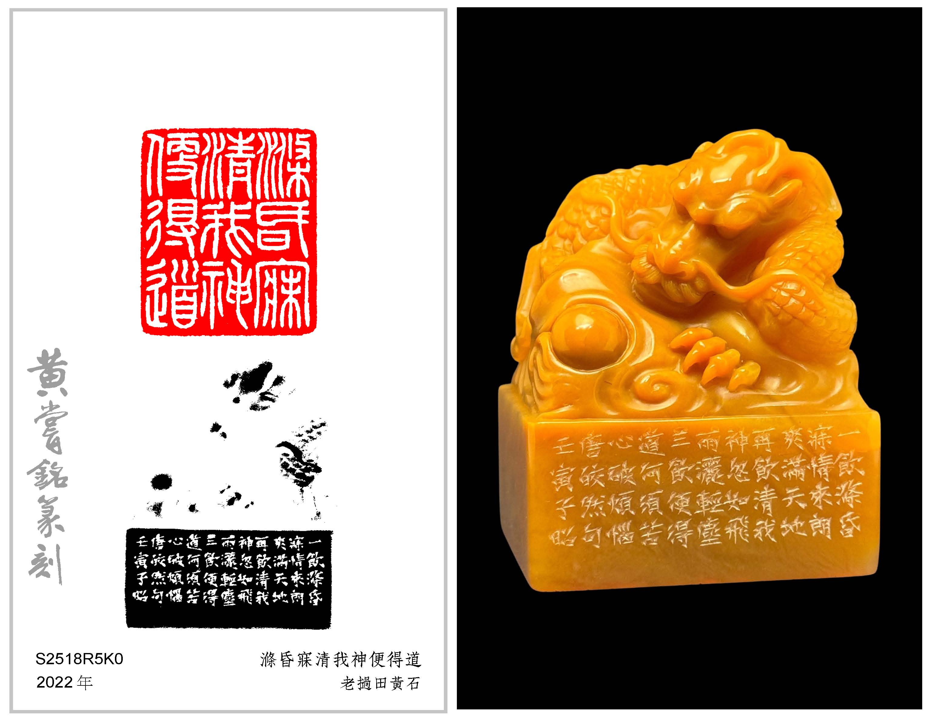 黃嘗銘.六十九歲/刻〔滌昏寐清我神便得道〕長方白文印。邊款為【一飲滌昏寐,情來朗爽滿天地。再飲清我神,忽如飛雨灑輕塵。三飲便得道,何須苦心破煩惱。唐皎然句。壬寅,子昭。】老撾田黃石。雲龍戲珠鈕。