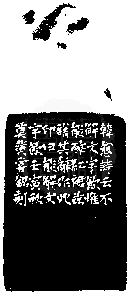 黃嘗銘.六十九歲/刻〔能解文字飲〕正方加框白文印。邊款為【韓愈詩云:「不解文字飲,惟能醉紅裙。」茲藉其辭作此印,曰:能解文字飲。壬寅秋莫,黃嘗銘刻。】老撾石。母子獸鈕。