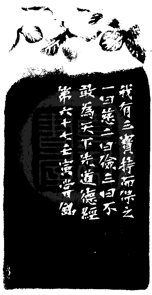 黃嘗銘.六十九歲/刻〔不敢為天下先〕長方加框白文印。邊款為【我有三寶,持而保之。一曰慈,二曰儉,三曰不敢為天下先。《道德經》第六十七。壬寅,嘗銘。】老撾石。雙螭花果鈕。