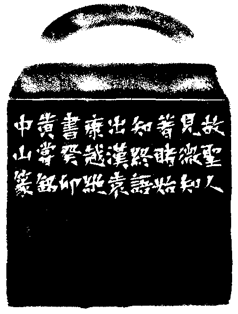 黃嘗銘.七十歲/刻〔見微知著〕長方白文縱格印。邊款為【故聖人見微知著,睹始知終。語出漢袁康《越絕書》。癸卯,黃嘗銘中山篆。】老撾南石。瓦鈕。
