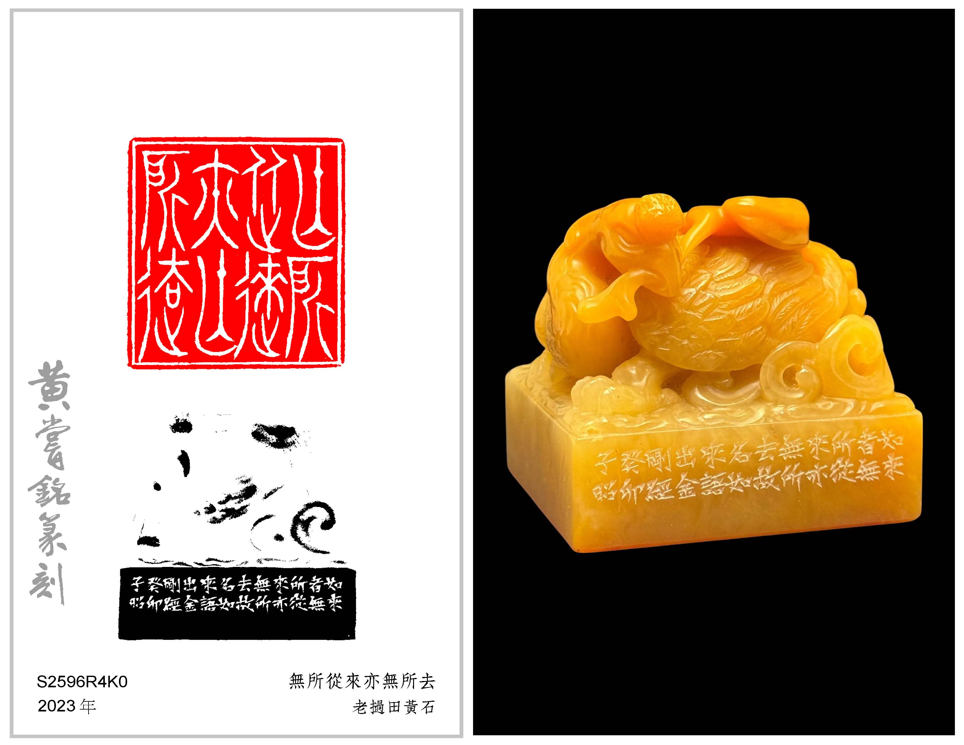 黃嘗銘.七十歲/刻〔無所從來亦無所去〕正方加框白文印。邊款為【如來者,無所從來,亦無所去,故名如來。語出《金剛經》句。癸卯,子昭。】老撾田黃石。鳳芝鈕。