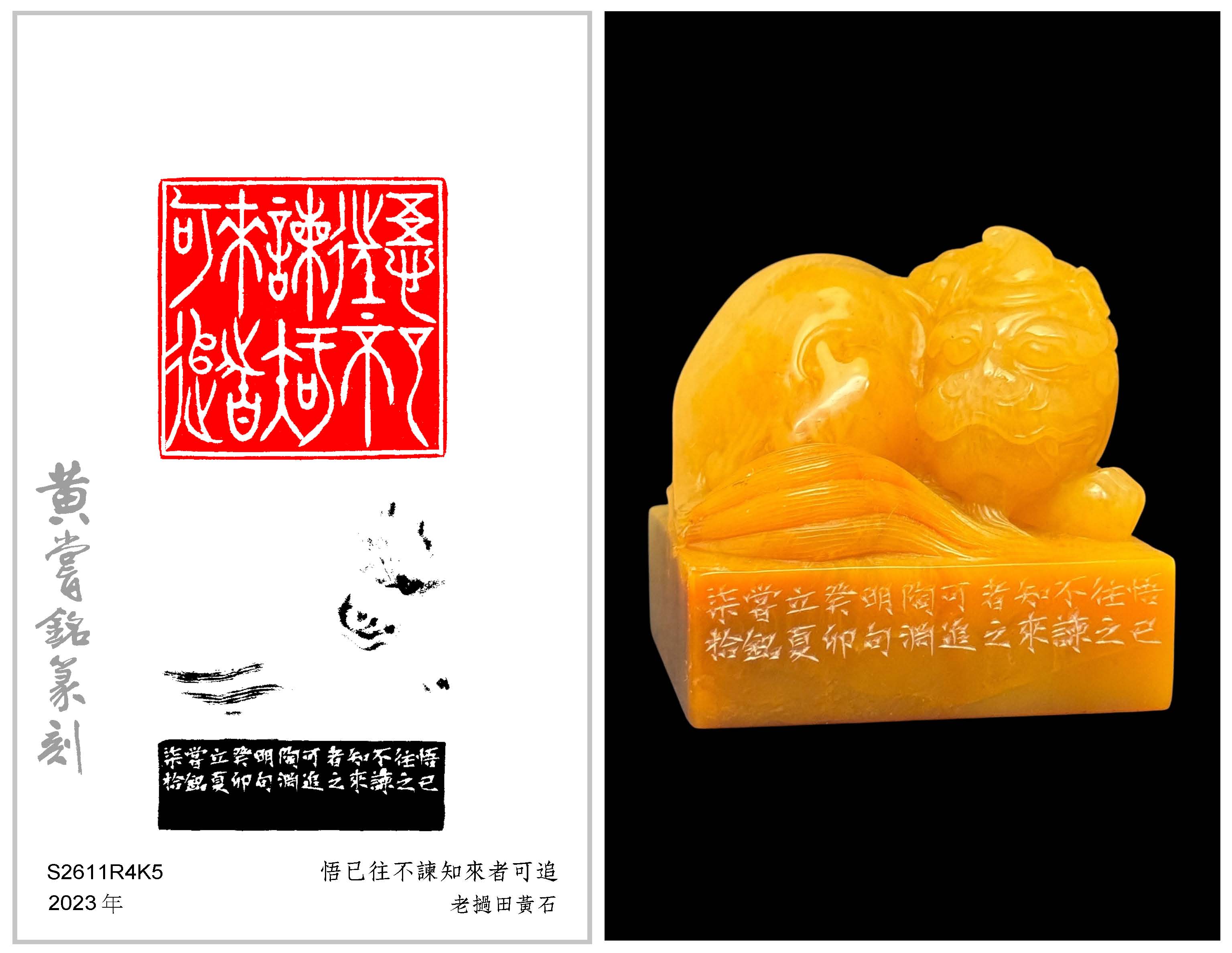 黃嘗銘.七十歲/刻〔悟已往不諫知來者可追〕正方加框白文印。邊款為【悟已往之不諫,知來者之可追。陶淵明句。癸卯立夏,嘗銘柒拾。】老撾田黃石。古獸鈕。