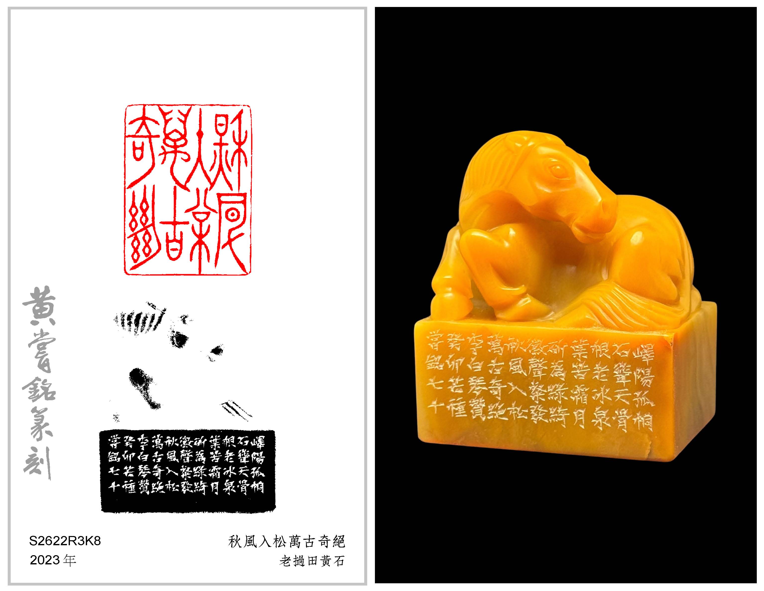 黃嘗銘.七十歲/刻〔秋風入松萬古奇絕〕長方朱文印。邊款為【嶧陽孤桐,石聳天骨。根老冰泉,葉苦霜月。斫為綠綺,徽聲粲發。秋風入松,萬古奇絕。 李白《琴贊》。癸卯芒種,嘗銘七十。】老撾田黃石。馬鈕。
