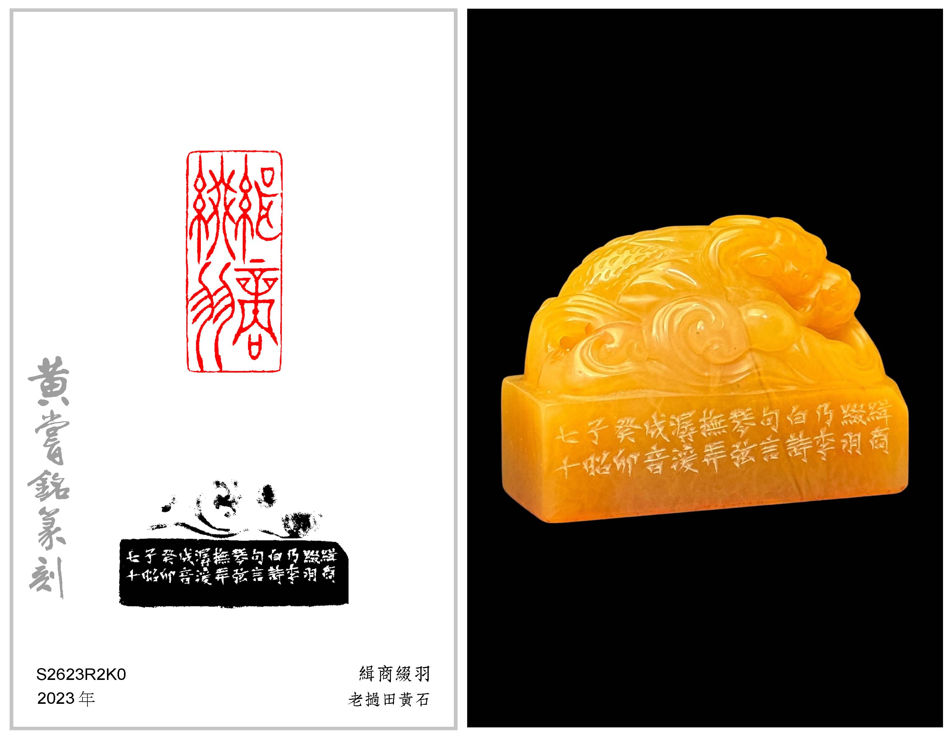 黃嘗銘.七十歲/刻〔緝商綴羽〕長方朱文印。邊款為【緝商綴羽,乃李白詩句,言琴弦撫弄,潺湲成音。癸卯,子昭七十。】老撾田黃石。鰲龍鈕。  2023 年刻