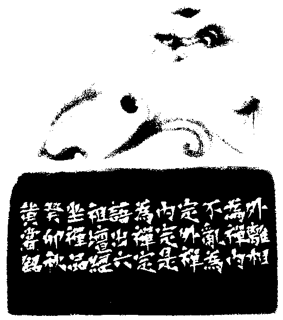 黃嘗銘.七十歲/刻〔離相不亂〕長方加框白文印。邊款為【外離相為禪,內不亂為定。外禪內定,是為禪定。語出《六祖壇經.坐禪品》。癸卯秋,黃嘗銘。】老撾南凍石。螭鈕。