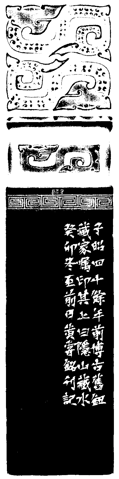 黃嘗銘.七十歲/刻〔隱山藏水〕正方朱文印。邊款為【子昭四十餘年前博古舊鈕,藏家囑印其上,曰隱山藏水。癸卯冬至前日,黃嘗銘刊記。】封門青青田。雙瓏博古鈕。