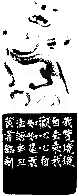 黃嘗銘.六十八歲/刻〔心自如如〕正方朱文印。邊款為【我覽境,境自去來;我觀心,心自如如。星雲法語。辛丑,黃嘗銘刻。】老撾田黃石。雙螭鈕。
