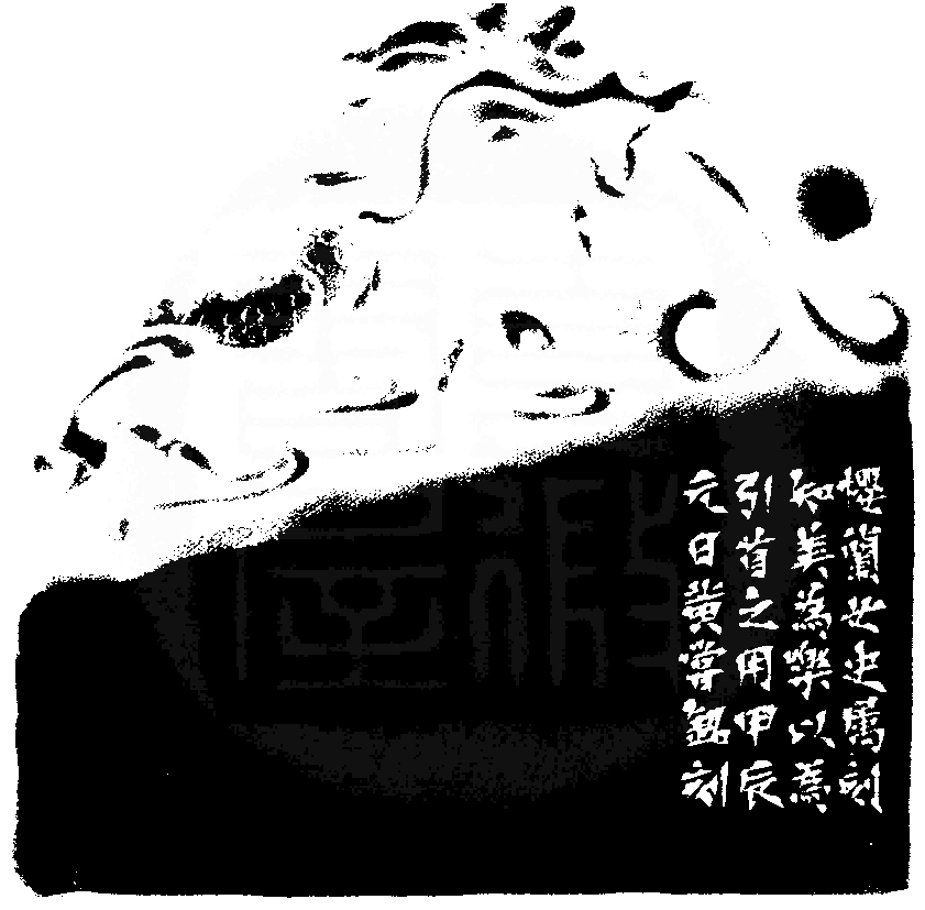 黃嘗銘.七十一歲/刻〔知美為樂〕長方朱文印。邊款為【櫻蘭女史屬刻知美為樂以為引首之用,甲辰元日,黃嘗銘刻。】老撾田黃石。龍珠鈕。  2024 年刻