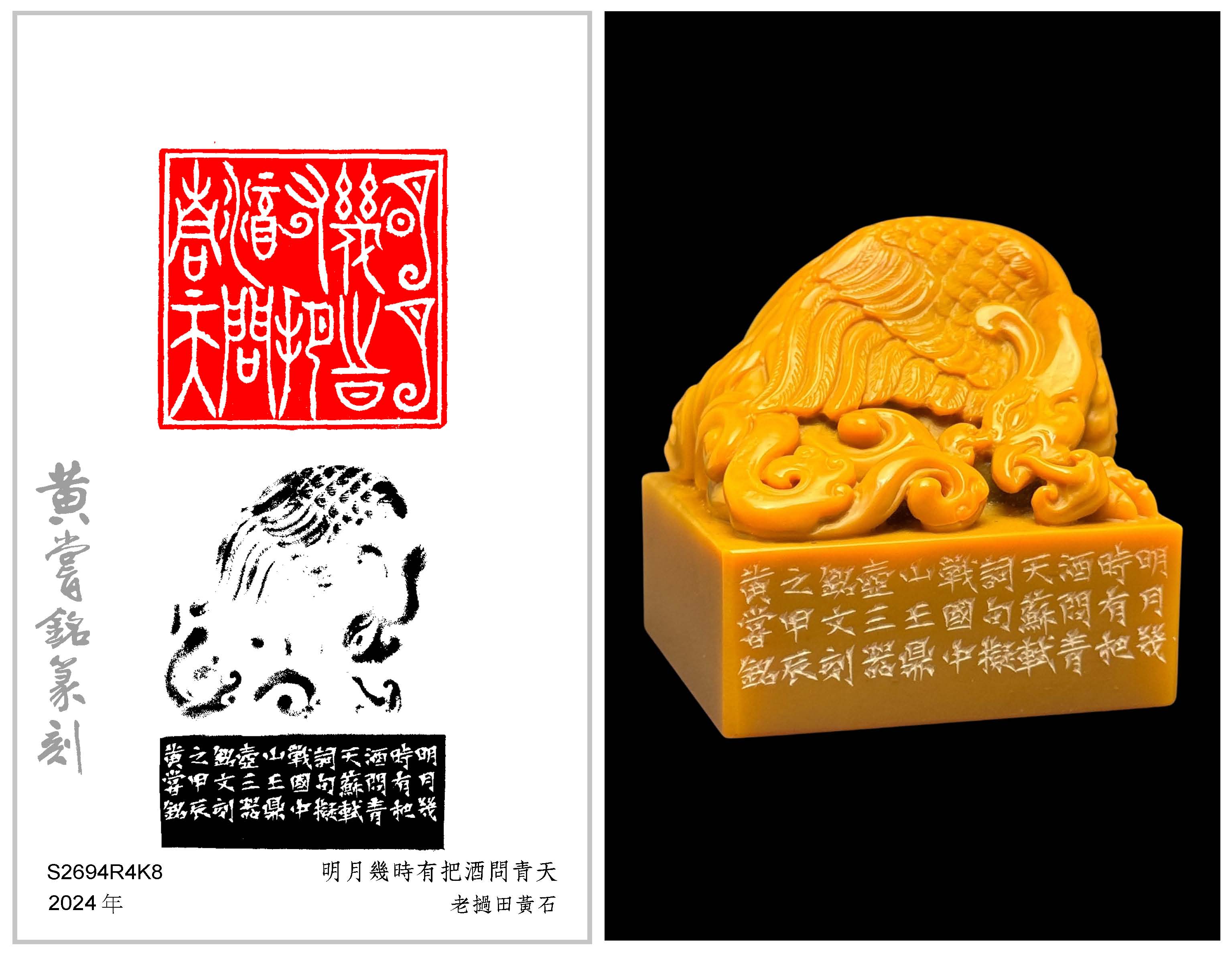 黃嘗銘.七十一歲/刻〔明月幾時有把酒問青天〕正方加框白文印。邊款為【明月幾時有?把酒問青天。蘇軾詞句。擬戰國中山王鼎壺三器銘文刻之。甲辰,黃嘗銘。】老撾田黃石。鳳鈕。  2024 年刻