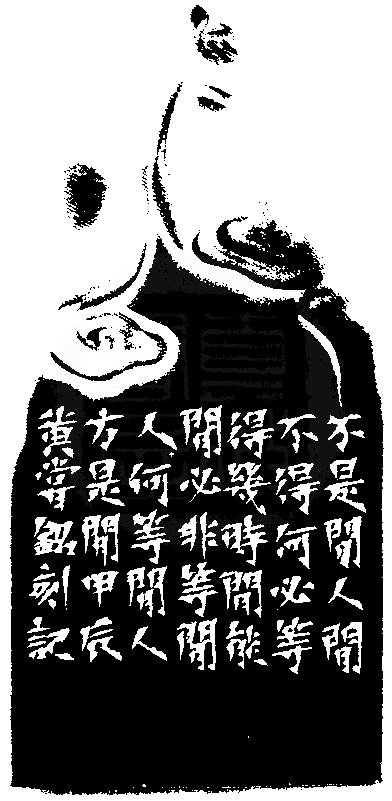 黃嘗銘.七十一歲/刻〔何等閒人〕正方朱文印。邊款為【不是閒人閒不得,何必等得幾時閒,能閒必非等閒人,何等閒人方是閒。甲辰,黃嘗銘刻記。】老撾田黃石。龍珠鈕。