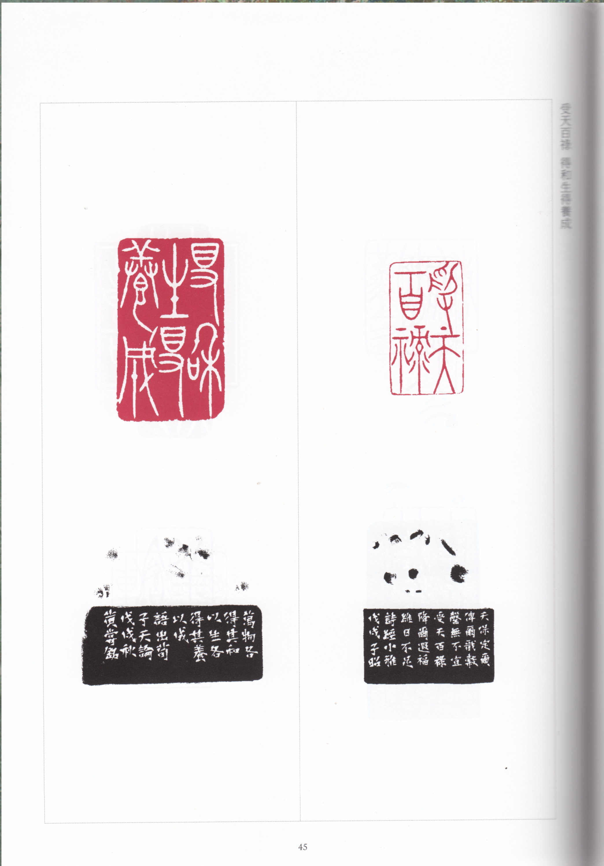 菊8開(A4),64頁,雪銅紙彩色精印。本書為作者2010年於台北、高雄、台中巡迴展覽之作品集,收錄作者最新的書法作品22件、印鈕作品7件、陶壺刻字6件,及〈壽延久久印譜〉、〈老子道德經選句印譜〉、〈禪本草印譜〉、〈茶十德印譜〉等篆刻作品138方,更收錄有創新的鈐拓印象系列作品10件,藉由印章多重陰陽疏密的層次,以馬賽克方式構築成多種視覺性圖像,有以小佛像組印構成各式莊嚴大佛像,也有以小文字組印繪成自畫像等,將篆刻藝術更推衍出一種鈐拓裝置藝術的新局面。書首有黃嘗銘自序一文,封面書籤則使用30餘年前王壯為先生為黃嘗銘所作之題書。 |