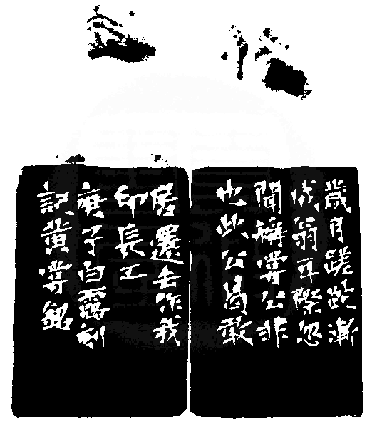 黃嘗銘.六十七歲/刻〔印長工〕正方朱文寬邊印。邊款為【歲月磋跎漸成翁,耳際忽聞稱嘗公。非也此公曷敢居,還去作我印長工。庚子白露刻記,黃嘗銘。】老撾田黃石。獸鈕。