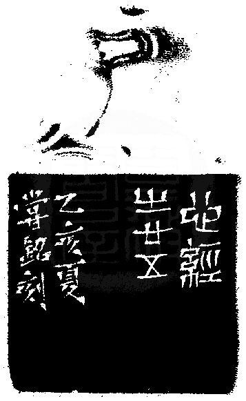 黃嘗銘.四十二歲/刻〔乃至無老死〕長方加框白文印。邊款為【心經之廿五。乙亥夏,嘗銘刻。】芙蓉石。