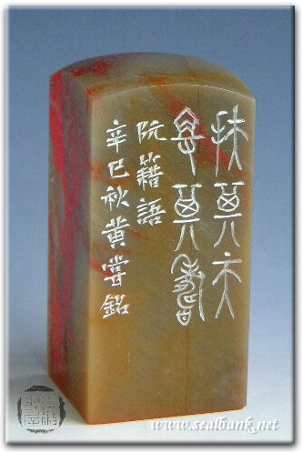 黃嘗銘.四十八歲/刻〔扶其天助其壽〕正方加框白文印。邊款為【扶其天助其壽。阮籍語。辛巳秋,黃嘗銘。】昌化雞血石。