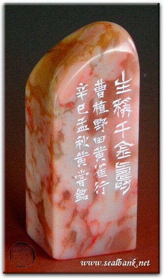黃嘗銘.四十八歲/刻〔主稱千金壽〕正方朱文印。邊款為【主稱千金壽。曹植野田黃雀行。辛巳孟秋,黃嘗銘。】巴林雞血石。